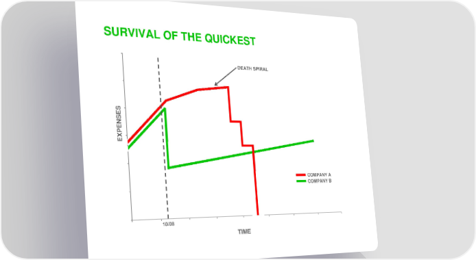 Startups and the Economic Downturn Page 48 Page 50SURVIVAL OF THE QUICKEST DEATH SPIRAL EXPENSES COMPANY A COMPANY B 10/08 TIME