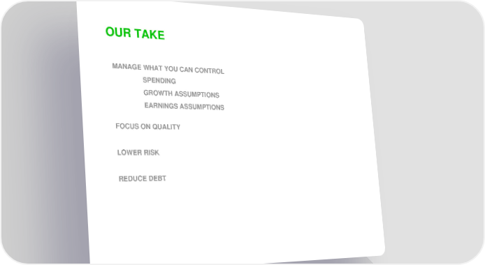 OUR TAKE MANAGE WHAT YOU CAN CONTROL SPENDING GROWTH ASSUMPTIONS EARNINGS ASSUMPTIONS FOCUS ON QUALITY LOWER RISK REDUCE DEBT