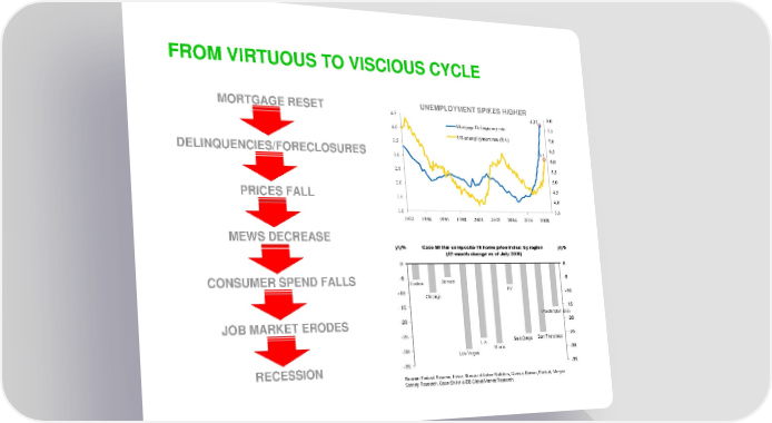 FROM VIRTUOUS TO VISCIOUS CYCLE MORTGAGE RESET UNEMPLOYMENT SPIKES HIGHER DELINQUENCIES/FORECLOSURES PRICES FALL MEWS DECREASE CONSUMER SPEND FALLS JOB MARKET ERODES RECESSION Source: Federal Reserve, Haver, Bureau of Labor Statistics, Census Bureau, Factset, Morgan Stanley Research, Case-Shiller & DB Global Market Research.