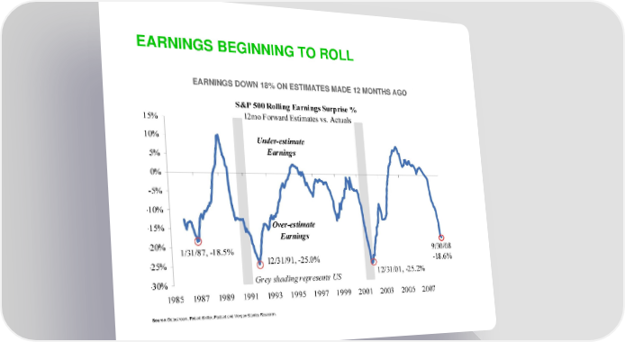 Startups and the Economic Downturn Page 29 Page 31EARNINGS BEGINNING TO ROLL EARNINGS DOWN 18% ON ESTIMATES MADE 12 MONTHS AGO Source: Datastream, Robert Shiller, Factset and Morgan Stanley Research.