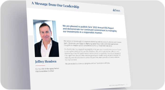 A Message from Our Leadership We are pleased to publish Siris’ 2022 Annual ESG Report and demonstrate our continued commitment to managing our investments in a responsible manner. We believe in the strength of corporate citizenship and the value of a diverse and inclusive team. We remain committed to deploying capital responsibly and where appropriate, thoughtfully integrating ESG considerations into our investment decisions. Our leadership has engaged meaningfully in the past year to implement a series of steps to strengthen and improve our ESG initiatives. First, we broadened the collection and monitoring of key ESG performance metrics across our portfolio. Second, we integrated ESG topics into our portfolio company governance model. Lastly, we performed an ESG maturity and risk assessment across the portfolio, which provided recommendations Jeffrey Hendren for improvement. We are excited to share our progress and our future plans with you. Co-Founder & Managing Partner ESG Committee Co-Chair 2022 Siris Capital ESG Report | 5