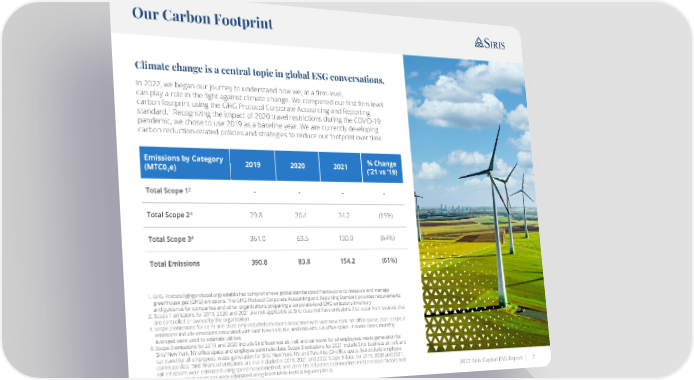 Our Carbon Footprint Climate change is a central topic in global ESG conversations. In 2022, we began our journey to understand how we, at a firm-level, can play a role in the fight against climate change. We completed our first firm-level carbon footprint using the GHG Protocol Corporate Accounting and Reporting standard.1 Recognizing the impact of 2020 travel restrictions during the COVID-19 pandemic, we chose to use 2019 as a baseline year. We are currently developing carbon reduction-related policies and strategies to reduce our footprint over time. Emissions by Category 2019 2020 2021 % Change (MTC0 e) (’21 vs ’19) 2 Total Scope 12 - - - - Total Scope 23 29.8 20.4 24.2 (19%) Total Scope 34 361.0 63.5 130.0 (64%) Total Emissions 390.8 83.8 154.2 (61%) 1. GHG Protocol (ghgprotocol.org) establishes comprehensive global standardized frameworks to measure and manage greenhouse gas (GHG) emissions. The GHG Protocol Corporate Accounting and Reporting Standard provides requirements and guidance for companies and other organizations preparing a corporate-level GHG emissions inventory 2. Scope 1 emissions for 2019, 2020 and 2021 are not applicable as Siris does not have emissions that occur from sources that are controlled or owned by the organization. 3. Scope 2 emissions for 2019 and 2020 only included emissions associated with Siris’ New York, NY office space. 2021 Scope 2 emissions include emissions associated with Siris’ New York, NY, and Palo Alto, CA office space. In some cases, monthly averages were used to estimate utilities. 4. Scope 3 emissions for 2019 and 2020 include Siris’ business air, rail, and car travel for all employees, waste generation for Siris’ New York, NY office space and employee commute data. Scope 3 emissions for 2021 include Siris’ business air, rail, and car travel for all employees, waste generation for Siris’ New York, NY, and Palo Alto, CA office space, but exclude employee commute data. Siris’ financed emissions are not included in 2019, 2021 and 2022 Scope 3 data. For 2019, 2020 and 2021, rail emissions were estimated using spend-based method, and 2016 US Industries Commodities EEIO emission factors and waste-generated emissions were estimated using latest MSW Facts & Figures (2012). 2022 Siris Capital ESG Report | 7