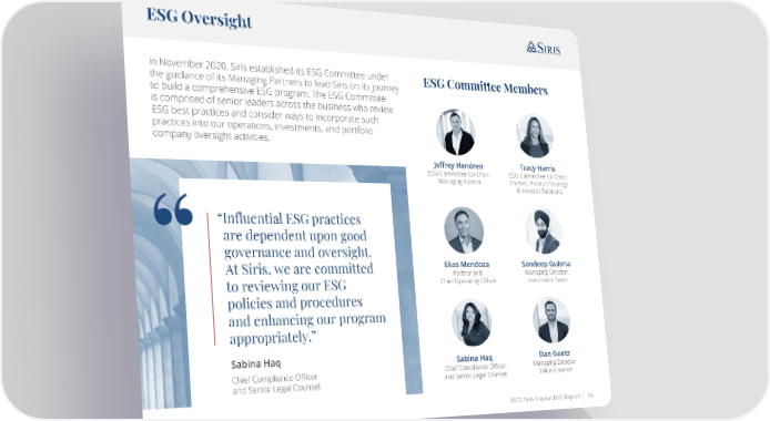 ESG Oversight In November 2020, Siris established its ESG Committee under ESG Committee Members the guidance of its Managing Partners to lead Siris on its journey to build a comprehensive ESG program. The ESG Committee is comprised of senior leaders across the business who review ESG best practices and consider ways to incorporate such practices into our operations, investments, and portfolio company oversight activities. Jeffrey Hendren Tracy Harris ESG Committee Co-Chair, ESG Committee Co-Chair, Managing Partner Partner, Product Strategy & Investor Relations “Influential ESG practices are dependent upon good governance and oversight. At Siris, we are committed Elias Mendoza Sandeep Guleria Partner and Managing Director, to reviewing our ESG Chief Operating Officer Investment Team policies and procedures and enhancing our program appropriately.” Sabina Haq Sabina Haq Dan Goetz Chief Compliance Officer Chief Compliance Officer Managing Director, and Senior Legal Counsel and Senior Legal Counsel Value Creation 2022 Siris Capital ESG Report | 14