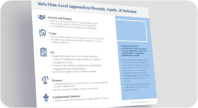 Siris Firm-Level Approach to Diversity, Equity, & Inclusion Govern and Engage • DE&I council executes mission and periodically engages with external partners, and solicits internal feedback • Formal DE&I Policy provides guidance and philosophy Train • Provide DE&I training: interviewing, inclusion, unconscious bias • Establish career development tools and policies to enhance leadership diversity In February 2022, Siris, in collaboration with its portfolio company Digital River, sponsored Act a virtual event in recognition • Support and engage with non-profit organizations to of Black History Month. support furthering DE&I initiatives within the investment Siris Co-Founder and Managing Partner management industry Frank Baker conducted a fireside chat • Continue to strengthen our program through periodically with a member of Digital River’s Diversity engaging with external DE&I advisors and Inclusion Council. In the discussion, • Build and strengthen diverse candidate pipelines Frank reflected on his own personal experiences and career journey, the challenges of inequality, and the value Measure and impact of diversity, equity, and • Consistently monitor our team diversity, including the diversity inclusion. of our candidate pools The event was attended by more than • Provide qualitative feedback tools in annual review 1,000 employees across Siris and its portfolio companies. Continuously Improve • Foster a culture of inclusion and find opportunities to improve 2022 Siris Capital ESG Report | 17