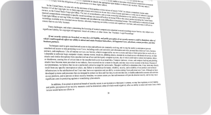 27/264 Difficulties in obtaining accurate and comprehensive information necessary to identify the compositions embodied in sound recordings on our Service and the ownership thereof may impact our ability to perform our obligations under our licenses, affect the size of our catalog, impact our ability to control content acquisition costs, and lead to potential copyright infringement claims. Comprehensive and accurate ownership information for the musical compositions embodied in sound recordings is often unavailable to us or difficult or, in some cases, impossible for us to obtain, sometimes because it is withheld by the owners or administrators of such rights. We currently rely on the assistance of third parties to determine this information. If the information provided to us or obtained by such third parties does not comprehensively or accurately identify the ownership of musical compositions, or if we are unable to determine which musical compositions correspond to specific sound recordings, it may be difficult or impossible to identify the appropriate rights holders to whom to pay royalties. This may make it difficult to comply with the obligations of any agreements with those rights holders. In the United States, we also rely on the assistance of third parties to issue notices of intent (“NOIs”) to obtain a compulsory license under Section 115 of the Copyright Act to those copyright owners with whom we do not have a direct license agreement or, in the case of unknown copyright owners, to the United States Copyright Office. The lack of comprehensive and accurate ownership information or the inability to determine which musical compositions correspond to specific sound recordings can cause difficulties in issuing NOIs to the correct parties (including the United States Copyright Office) or serving NOIs in a timely manner and can otherwise cause difficulties in obtaining licenses. This could lead to a reduction of sound recordings available to be streamed on our Service, adversely impacting our ability to retain and expand our User base, and could make it difficult to ensure that we are fully licensed. These challenges, and others concerning the licensing of musical compositions embodied in sound recordings on our Service, may subject us to significant liability for copyright infringement, breach of contract, or other claims. See “Business—Legal Proceedings.” If our security systems are breached, we may face civil liability, and public perception of our security measures could be diminished, either of which would negatively affect our ability to attract and retain Premium Subscribers, AdSupported Users, advertisers, content providers, and other business partners. Techniques used to gain unauthorized access to data and software are constantly evolving, and we may be unable to anticipate or prevent unauthorized access to data pertaining to our Users, including credit card and debit card information and other personal data about our Users, business partners, and employees. Like all internet services, our Service, which is supported by our own systems and those of third parties that we work with, is vulnerable to software bugs, computer viruses, internet worms, breakins, phishing attacks, attempts to overload servers with denialofservice, or other attacks and similar disruptions from unauthorized use of our and thirdparty computer systems, any of which could lead to system interruptions, delays, or shutdowns, causing loss of critical data or the unauthorized access to personal data. Computer malware, viruses, and computer hacking and phishing attacks have become more prevalent in our industry, have occurred on our systems in the past, and may occur on our systems in the future. Because of our prominence, we believe that we are a particularly attractive target for such attacks. Though it is difficult to determine what, if any, harm may directly result from any specific interruption or attack, any failure to maintain performance, reliability, security, and availability of our products and technical infrastructure to the satisfaction of our Users may harm our reputation and our ability to retain existing Users and attract new Users. Although we have developed systems and processes that are designed to protect our data and User data, to prevent data loss, to disable undesirable accounts and activities on our platform, and to prevent or detect security breaches, we cannot assure you that such measures will provide absolute security, and we may incur significant costs in protecting against or remediating cyberattacks. In addition, if an actual or perceived breach of security occurs to our systems or a third party’s systems, we may face regulatory or civil liability and public perception of our security measures could be diminished, either of which would negatively affect our ability to attract and retain Users, which in turn would harm our efforts to 20