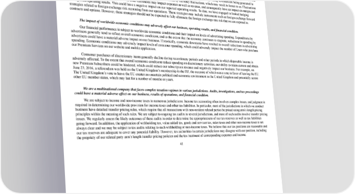48/264 If currency exchange rates fluctuate substantially in the future, the results of our operations, which are reported in Euros, could be adversely affected. As we continue to expand our international operations, we become increasingly exposed to the effects of fluctuations in currency exchange rates. We incur expenses for employee compensation, rental fees, and other operating expenses in the local currency, and an increasing percentage of our international revenue is from Users who pay us in currencies other than U.S. dollars and Euros, including the Swedish Krona, the Australian dollar, and the British Pound Sterling. We also incur royalty expenses primarily in U.S. dollars and Euros, but the corresponding revenues are being generated in local currencies and, as such, the multiple currency conversions will be affected by currency fluctuations, which may result in losses to us. Fluctuations in the exchange rates between the Euro and other currencies may impact expenses as well as revenue, and consequently have an impact on margin and the reported operating results. This could have a negative impact on our reported operating results. To date, we have engaged in limited hedging strategies related to foreign exchange risk stemming from our operations. These strategies may include instruments such as foreign exchange forward contracts and options. However, these strategies should not be expected to fully eliminate the foreign exchange rate risk that we are exposed to. The impact of worldwide economic conditions may adversely affect our business, operating results, and financial condition. Our financial performance is subject to worldwide economic conditions and their impact on levels of advertising spending. Expenditures by advertisers generally tend to reflect overall economic conditions, and to the extent that the economy continues to stagnate, reductions in spending by advertisers could have a material adverse impact on our business. Historically, economic downturns have resulted in overall reductions in advertising spending. Economic conditions may adversely impact levels of consumer spending, which could adversely impact the number of Users who purchase our Premium Services on our website and mobile application. Consumer purchases of discretionary items generally decline during recessionary periods and other periods in which disposable income is adversely affected. To the extent that overall economic conditions reduce spending on discretionary activities, our ability to retain current and obtain new Premium Subscribers could be hindered, which could reduce our subscription revenue and negatively impact our business. For example, on June 23, 2016, a referendum was held on the United Kingdom’s membership in the EU, the outcome of which was a vote in favor of leaving the EU. The United Kingdom’s vote to leave the EU creates an uncertain political and economic environment in the United Kingdom and potentially across other EU member states, which may last for a number of months or years. We are a multinational company that faces complex taxation regimes in various jurisdictions. Audits, investigations, and tax proceedings could have a material adverse effect on our business, results of operations, and financial condition. We are subject to income and nonincome taxes in numerous jurisdictions. Income tax accounting often involves complex issues, and judgment is required in determining our worldwide provision for income taxes and other tax liabilities. In particular, most of the jurisdictions in which we conduct business have detailed transfer pricing rules, which require that all transactions with nonresident related parties be priced using arm’s length pricing principles within the meaning of such rules. We are subject to ongoing tax audits in several jurisdictions, and most of such audits involve transfer pricing issues. We regularly assess the likely outcomes of these audits in order to determine the appropriateness of our tax reserves as well as tax liabilities going forward. In addition, the application of withholding tax, value added tax, goods and services tax, sales taxes and other nonincome taxes is not always clear and we may be subject to tax audits relating to such withholding or nonincome taxes. We believe that our tax positions are reasonable and our tax reserves are adequate to cover any potential liability. However, tax authorities in certain jurisdictions may disagree with our position, including the propriety of our related party arm’s length transfer pricing policies and the tax treatment of corresponding expenses and income. 41