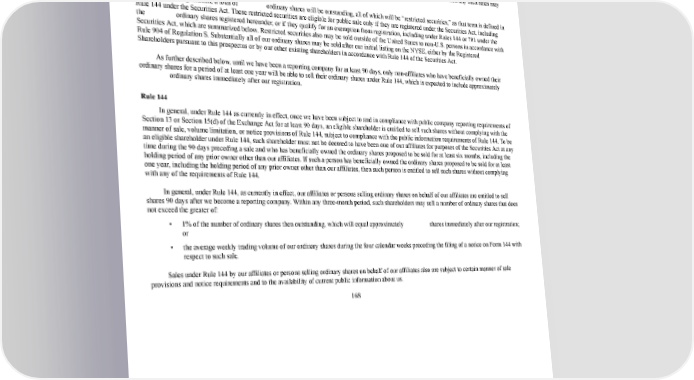 175/264 SHARES ELIGIBLE FOR FUTURE SALE Prior to the listing of our ordinary shares on the NYSE, there has been no public market for our ordinary shares. Sales of substantial amounts of our ordinary shares in the public market following our listing on the NYSE, or the perception that such sales could occur, could adversely affect the public price of our ordinary shares and may make it more difficult for you to sell your ordinary shares at a time and price that you deem appropriate. We will have no input if and when any Registered Shareholder may, or may not, elect to sell their ordinary shares or the prices at which any such sales may occur. Upon our registration, a total of ordinary shares will be outstanding, all of which will be “restricted securities,” as that term is defined in Rule 144 under the Securities Act. These restricted securities are eligible for public sale only if they are registered under the Securities Act, including the ordinary shares registered hereunder, or if they qualify for an exemption from registration, including under Rules 144 or 701 under the Securities Act, which are summarized below. Restricted securities also may be sold outside of the United States to nonU.S. persons in accordance with Rule 904 of Regulation S. Substantially all of our ordinary shares may be sold after our initial listing on the NYSE, either by the Registered Shareholders pursuant to this prospectus or by our other existing shareholders in accordance with Rule 144 of the Securities Act. As further described below, until we have been a reporting company for at least 90 days, only nonaffiliates who have beneficially owned their ordinary shares for a period of at least one year will be able to sell their ordinary shares under Rule 144, which is expected to include approximately ordinary shares immediately after our registration. Rule 144 In general, under Rule 144 as currently in effect, once we have been subject to and in compliance with public company reporting requirements of Section 13 or Section 15(d) of the Exchange Act for at least 90 days, an eligible shareholder is entitled to sell such shares without complying with the manner of sale, volume limitation, or notice provisions of Rule 144, subject to compliance with the public information requirements of Rule 144. To be an eligible shareholder under Rule 144, such shareholder must not be deemed to have been one of our affiliates for purposes of the Securities Act at any time during the 90 days preceding a sale and who has beneficially owned the ordinary shares proposed to be sold for at least six months, including the holding period of any prior owner other than our affiliates. If such a person has beneficially owned the ordinary shares proposed to be sold for at least one year, including the holding period of any prior owner other than our affiliates, then such person is entitled to sell such shares without complying with any of the requirements of Rule 144. In general, under Rule 144, as currently in effect, our affiliates or persons selling ordinary shares on behalf of our affiliates are entitled to sell shares 90 days after we become a reporting company. Within any threemonth period, such shareholders may sell a number of ordinary shares that does not exceed the greater of: • 1% of the number of ordinary shares then outstanding, which will equal approximately shares immediately after our registration; or • the average weekly trading volume of our ordinary shares during the four calendar weeks preceding the filing of a notice on Form 144 with respect to such sale. Sales under Rule 144 by our affiliates or persons selling ordinary shares on behalf of our affiliates also are subject to certain manner of sale provisions and notice requirements and to the availability of current public information about us. 168