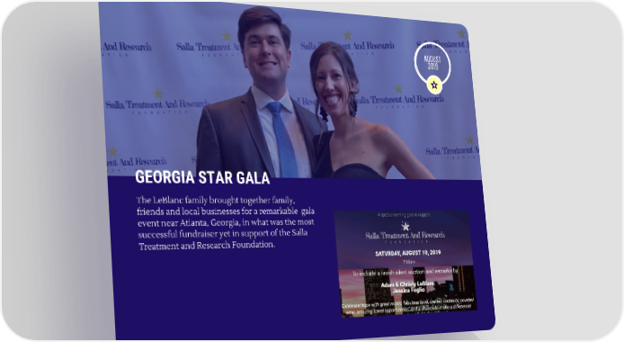AUGUST 2019 GEORGIA STAR GALA The LeBlanc family brought together family, friends and local businesses for a remarkable gala event near Atlanta, Georgia, in what was the most successful fundraiser yet in support of the Salla Treatment and Research Foundation.