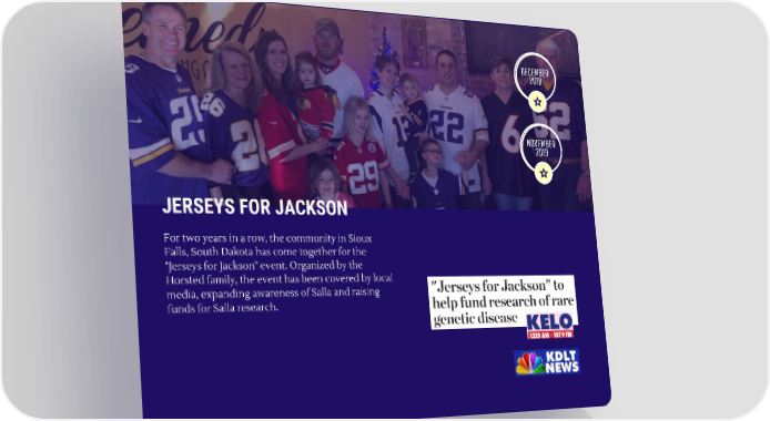 DECEMBER 2018 NOVEMBER 2019 JERSEYS FOR JACKSON For two years in a row, the community in Sioux Falls, South Dakota has come together for the "Jerseys for Jackson" event. Organized by the Horsted family, the event has been covered by local media, expanding awareness of Salla and raising funds for Salla research.