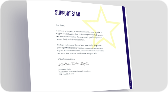 SUPPORT STAR Dear friend, It has been so inspiring to see our communities come together in support of Salla families since the founding of the Salla Treatment and Research Foundation. We are eternally grateful to you, our friends, family, and all our supporters. The hope and progress that has been generated in the past two years is just the beginning. Together, we can make an enormous impact. Advancements in Salla research and treatments is within our reach. And we know it will happen with your help. With all our gratitude, Jessica Klein-Foglio Jessica Klein-Foglio, President, Salla Treatment And Research Foundation (Mikey's and Ben's mom) SUPPORT STAR 18