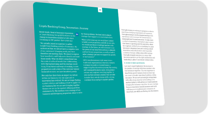 25 Lloyds Banking Group, Innovation Journey Startupbootcamp is evolving its program in order to meet these changing requirements of innovation. Derek Smith, Head of Insurance Innovation for those problems. We then look to plug in Startupbootcamp is reinforcing partnerships with at Lloyds Banking Group (LBG) reflects on the startups that support us to reach that vision. operational units to ensure the commitment to change in innovation mindset at LBG since meaningful and focused execution. To help create becoming an SBC partner three years ago. Where a few years ago we would have looked a culture of innovation, Startupbootcamp is aware to build a new proposition entirely on our own, that there is a growing need for execution, where “We initially joined as a partner to gather we would now look to build and partner with the emphasis will be first on identifying the pains insight from thinking outside of insurance. We startups. In the future, we will continue to use insurance companies have and creating a small understood that we did not have a complete view the power of our InsurTech network to identify innovation team which will be able to provide of our customers’ changing needs, and were and test future propositions, as well as look to a solution through collaboration with startups. therefore not meeting them. We joined to explore select strategic partners to support the growth Startupbootcamp’s mission is to ensure that how InsurTech could help us to identify and meet of our business.” insurance partners get the right mechanisms and those needs. What we didn’t comprehend was LBG’s transformational shift away from a leadership in place to accelerate brilliant ideas. the scale of cultural benefit that collaborating traditional organizational structure, towards ii. Access to talent and diversity with Startupbootcamp and the startups would customer focused, co-located teams is bring. From talent and ways of working, to new supporting this innovation journey. By creating Last year’s report highlighted the increase in propositions and a view of the customer beyond self-contained business units, with product the number of startups with team members who financial services, we have benefited greatly. owners and engineers working together to had insurance expertise. This was important as Not only has there been an impact on culture own the full customer journey, they are able InsurTechs moved beyond a focus on front-end within our business, but our approach to to make their own decisions with a strong use cases to broader operational problems within innovation has evolved. We are no longer finding customer focus and go to market quicker. insurance. We are now increasingly seeing teams a point solution and looking at how to apply it to with either deep expertise in technology, or in our business, but we are now bringing together another industry, with advisors or board members themes we see in the market, defining problem bringing the insurance expertise. As more startups statements for the medium term strategy of our focus on innovation beyond insurance and work business and designing proposition ideas to solve with insurers to build a broader ecosystem of InsurTech, new skills are flowing into the industry.