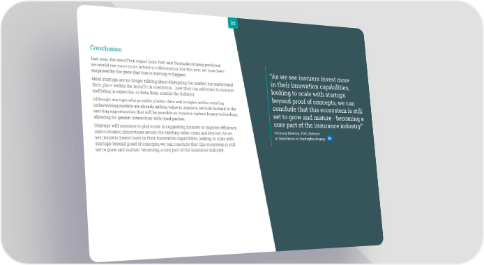 32 Conclusion Last year, the InsurTech report from PwC and Startupbootcamp predicted we would see more cross industry collaboration, but this year we have been “As we see insurers invest more surprised by the pace that this is starting to happen. in their innovation capabilities, Most startups are no longer talking about disrupting the market, but understand their place within the InsurTech ecosystem - how they can add value to insurers looking to scale with startups and bring in expertise, or data, from outside the industry. beyond proof of concepts, we can Although startups who providing better data and insights within existing conclude that this ecosystem is still underwriting models are already adding value to insurers, we look forward to the exciting opportunities that will be possible as insurers replace legacy technology, set to grow and mature - becoming a allowing for greater interaction with third parties. core part of the insurance industry” Startups will continue to play a role in supporting insurers to improve efficiency and customer interactions across the existing value chain and beyond. As we Victoria Newton, PwC Advisor see insurers invest more in their innovation capabilities, looking to scale with in Residence to Startupbootcamp startups beyond proof of concepts, we can conclude that this ecosystem is still set to grow and mature- becoming a core part of the insurance industry.