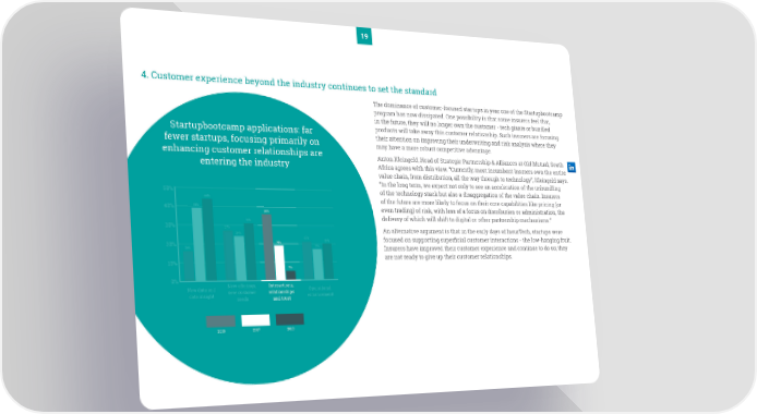 19 4. Customer experience beyond the industry continues to set the standard The dominance of customer-focused startups in year one of the Startupbootcamp program has now dissipated. One possibility is that some insurers feel that, in the future, they will no longer own the customer - tech giants or bundled Startupbootcamp applications: far products will take away this customer relationship. Such insurers are focusing fewer startups, focusing primarily on their attention on improving their underwriting and risk analysis where they enhancing customer relationships are may have a more robust competitive advantage. entering the industry Anton Kleingeld, Head of Strategic Partnership & Alliances at Old Mutual, South Africa agrees with this view. “Currently, most incumbent insurers own the entire value chain, from distribution, all the way through to technology”, Kleingeld says. “In the long term, we expect not only to see an acceleration of the unbundling 50% of the technology stack but also a disaggregation of the value chain. Insurers 44% of the future are more likely to focus on their core capabilities like pricing (or 40% 39% even trading) of risk, with less of a focus on distribution or administration, the 36% 31% delivery of which will shift to digital or other partnership mechanisms.” 30% 27% An alternative argument is that in the early days of InsurTech, startups were 24% 21% 20% focused on supporting superficial customer interactions - the low-hanging fruit. 20% 19% 16% 17% Insurers have improved their customer experience and continue to do so; they 10% are not ready to give up their customer relationships. 5% 0% New data and New offerings, Interactions, Operational data insight new customer relationships enhancement needs and trust 2016 2017 2018
