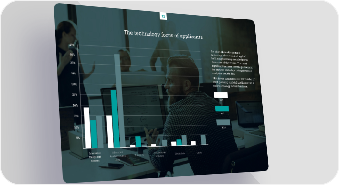 12 The technology focus of applicants 45% The chart shows the primary technology of startups that applied 40% for Startupbootcamp InsurTech over the course of three years. The most 35% significant increase over the period is in the number of startups using advanced analytics and big data. 35% This is one consequence of the number of startups using artificial intelligence as a 30% core technology in their business. 25% 2016 20% 15% 2017 10% 2018 5% Internet of Advanced Autonomous Things and Analytics & Big Robotics Vehciles Blockchain Cyber Sensors Data
