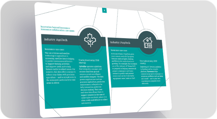 8 Innovation beyond insurance: insurance collaboration use cases Industry: AgriTech Industry: PropTech Insurance use case: Insurance use case: The use of drone and satellite At its most basic, PropTech gives technology in agriculture is users remote control of property increasing: satellite data is helping Startupbootcamp 2018 features such as lights, heating Startupbootcamp 2018 to predict environmental factors startup: and blinds, but sophistication is startup: to support farming activities growing. For example, the increased and improve yield, and to help CyStellar operates a platform use of the Internet of Things (IoT) Exploiting IoT devices, analytics farmers tackle localized issues. For that integrates, manages and in property is helping commercial technology and an insights insurers, this data offers a means to secures data from ground property managers and home platform, Flowenum helps reduce crop claims with precision sensors, aerial surveillance owners to predict and prevent commercial property managers to agriculture – and to extend cover to and satellite imagery. The data events such as fire from faulty minimize problems such as damp the uninsured, particularly in rural powers applications such as equipment, water leaks or theft. and mould – and to plan their areas in Africa. precision agriculture, predictive maintenance programs more maintenance, or logistics for efficiently. fully interactive, predictive decision making. Their near real-time data allows them to support insurers in the case of catastrophe incidents, where it is often costly and difficult to collect information.