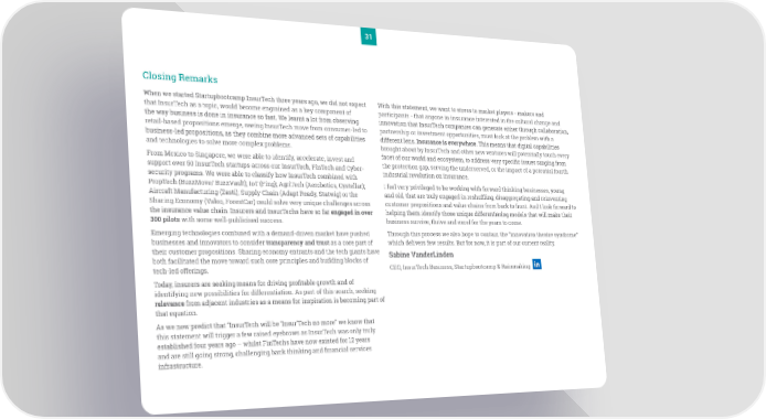31 Closing Remarks When we started Startupbootcamp InsurTech three years ago, we did not expect With this statement, we want to stress to market players - makers and that InsurTech as a topic, would become engrained as a key component of participants - that anyone in insurance interested in the cultural change and the way business is done in insurance so fast. We learnt a lot from observing innovation that InsurTech companies can generate either through collaboration, retail-based propositions emerge, seeing InsurTech move from consumer-led to partnership or investment opportunities, must look at the problem with a business-led propositions, as they combine more advanced sets of capabilities different lens. Insurance is everywhere. This means that digital capabilities and technologies to solve more complex problems. brought about by InsurTech and other new ventures will potentially touch every From Mexico to Singapore, we were able to identify, accelerate, invest and facet of our world and ecosystem, to address very specific issues ranging from support over 50 InsurTech startups across our InsurTech, FinTech and Cyber- the protection gap, serving the underserved, or the impact of a potential fourth security programs. We were able to classify how InsurTech combined with industrial revolution on insurance. PropTech (BuzzMove/ BuzzVault); IoT (Fing); AgriTech (Aerobotics, Cystellar); I feel very privileged to be working with forward thinking businesses, young Aircraft Manufacturing (Zasti); Supply Chain (Adapt Ready, Statwig) or the and old, that are truly engaged in reshuffling, disaggregating and reinventing Sharing Economy (Valoo, ForestCar) could solve very unique challenges across customer propositions and value chains from back to front. And I look forward to the insurance value chain. Insurers and InsurTechs have so far engaged in over helping them identify those unique differentiating models that will make their 300 pilots with some well-publicised success. business survive, thrive and excel for the years to come. Emerging technologies combined with a demand-driven market have pushed Through this process we also hope to contain the “innovation theatre syndrome” businesses and innovators to consider transparency and trust as a core part of which delivers few results. But for now, it is part of our current reality. their customer propositions. Sharing economy entrants and the tech giants have Sabine VanderLinden both facilitated the move toward such core principles and building blocks of tech-led offerings. CEO, InsurTech Business, Startupbootcamp & Rainmaking Today, insurers are seeking means for driving profitable growth and of identifying new possibilities for differentiation. As part of this search, seeking relevance from adjacent industries as a means for inspiration is becoming part of that equation. As we now predict that “InsurTech will be ‘Insur’Tech no more” we know that this statement will trigger a few raised eyebrows as InsurTech was only truly established four years ago – whilst FinTechs have now existed for 12 years and are still going strong, challenging bank thinking and financial services infrastructure.