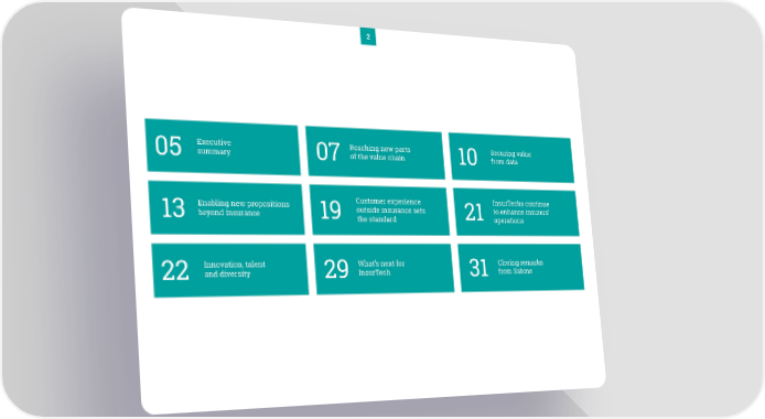 2 Executive Reaching new parts Securing value 05 summary 07 of the value chain 10 from data Enabling new propositions Customer experience InsurTechs continue 13 beyond insurance 19 outside insurance sets 21 to enhance insurers’ the standard operations Innovation, talent What’s next for Closing remarks 22 and diversity 29 InsurTech 31 from Sabine