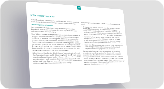 22 6. The broader value story It would be a mistake to look only at the tangible results of InsurTech innovation. More generally, insurers’ approach to Startupbootcamp reflects these partners’ In fact, startups in the sector are having an impact in many different ways. stories: i. An evolving culture of innovation • In year one of the program, many firms focused on watching and learning. Over three years of Startupbootcamp, InsurTech has brought real value to Both fearful and curious about the startups, insurers were happy to incumbents, and that value continues to shift as the ways in which insurers engage from the side-lines. But even in the absence of large numbers of embrace innovation continue to evolve. partnerships, the watch and learn approach stimulated in-house innovation. Insurers set up innovation teams to explore opportunities for transformation. Fiona Williams, Business Development Executive at Admiral explains the way in • In year two, the focus moved to tactical solutions and talent. A year on, which her business’s interaction with InsurTech startups continues to change. startups embraced collaboration with insurers, and we saw the uptake “At Admiral we have a test and learn approach and are always keen to explore of proof of concepts in tactical points across the value chain. Examples new ways of doing things and improving our service to our customers whether included digital processing of claims; white labelled distribution platforms. that is through trialling new software to optimize our existing service or offering our customers an entirely new product proposition”, Williams says. “In the next • In year three of the program, insurers are starting to scale proof of concepts, few years we will continue to be interested to monitor the ever-changing startup but are looking to overcome understandable hesitation from risk and landscape with a view to partnering where we see we can create an even better compliance teams in taking experimentation to execution. value proposition for both our new and existing customers.” The opportunity for insurers is to further capitalize on this innovation by Hélène Stanway, Digital Leader of XL Catlin, says: “Insurers have to evolve and co-creating the new value propositions. The alternative is to watch as this show buyers that they are capable of innovating. That is the only way to remain innovation takes place. But while insurers will still see some benefits from attractive and competitive and is what will make a difference in the next 5, 10, 15 this approach – reduced claims from customers using third-party preventive years. The industry needs to embrace the opportunity for change. At XL Catlin, services, for example – there will also be impacts; not least, these customers we have made it one of our core values to be future-focused, and that means that will expect lower premiums. Instead, engaging with co-creation provides a route collaborating with InsurTech companies is key to our strategy.” to stronger relationships with clients, and the potential to increase revenue in prevention, where there is more space to grow. Collaborate, don’t react: what the startups say