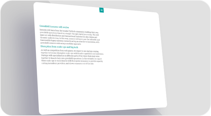 30 Greenfield insurers will evolve Insurers will learn from the broader FinTech community, building their own greenfield operations based on straight-through digital processing. This will span not only distribution and transactional business but also claims and dynamic underwriting. In this way, insurers will move past the inflexible and inaccessible legacy systems currently acting as a barrier to innovation, with greenfield insurers embracing a modular approach. Disruption from scale-ups and big tech As well as competition from tech giants, we expect to see startups coming together to become disruptive scale-ups with broader capabilities and ambitions. Startups with specialization in different parts of the value chain may come together to launch their own greenfield operations. In this scenario, we expect these scale-ups to work directly with first mover reinsurers to provide capacity, cutting incumbent providers, and slower reinsurers out of the mix.