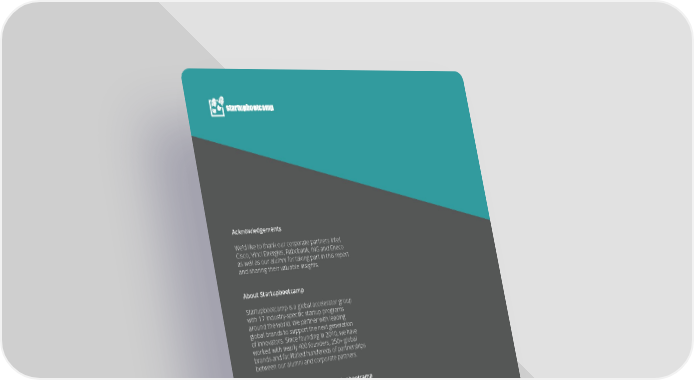Acknowledgements We’d like to thank our corporate partners Intel, Cisco, Vinci Energies, Rabobank, ING and Eneco as well as our alumni for taking part in this report and sharing their valuable insights. About Startupbootcamp Startupbootcamp is a global accelerator group with 17 industry-specific startup programs around the world. We partner with leading global brands to support the next generation of innovators. Since founding in 2010, we have worked with nearly 400 founders, 250+ global brands and facilitated hundereds of partnerships between our alumni and corporate partners. For more information about Startupbootcamp www.startupbootcamp.org For media inquiries [email protected] For partnership inquiries [email protected] Join the conversation #Collab2Innovate @Sbootcamp www.linkedin.com/Startupbootcamp www.facebook.com/Startupbootcamp