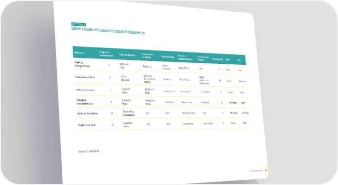 PICTURE 6 Different open-innovation mechanisms deployed by financial entities Initiative Corporate Cultural Impact Exposition Startup Stage Term for Commercial Strategic Fit Risk Cost Involvement to Media implementation Impact Startup 2 Medium / Medium Seed / Short Term Low 4 Low Low Competitions High Pre-seed Low / Limited High Commercial Pilot 5 Medium (only study Series A Short Term (short and 10 Low Medium cases) long term) CVC Investment 7 Limited / Medium / Series A - D Short Term Low / High 7 High High None High Mergers 8 Limited / Medium / Series C + Short Term Medium 9 Medium High & Acquisitions None High Internal Incubator 10 Depending No N/A Medium Term Low 7 Medium Medium on training Traditional R+D 10 Limited / No N/A Long Term Low / High 7 High High None Source: Finnovista A TWO-WAY PATH 52