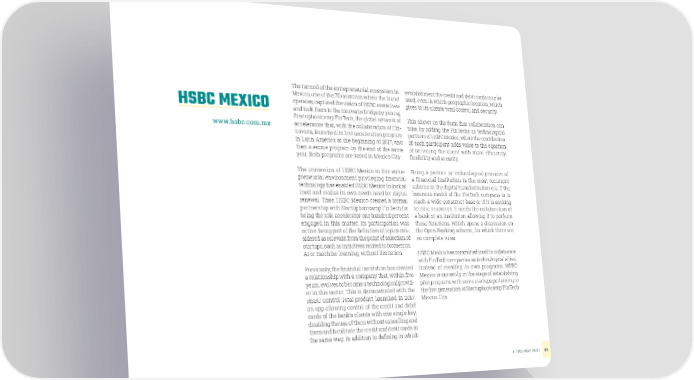 The turmoil of the entrepreneurial ecosystem in establishment the credit and debit cards may be Mexico, one of the 70 countries where the brand used, even in which geographic location, which HSBC MEXICO operates, captured the vision of HSBC executives gives to its clients total control and security. and took them to the innovator bridge by joining Startupbootcamp FinTech, the global network of This shows us the form that collaboration can www.hsbc.com.mx accelerators that, with the collaboration of Fin- take, by adding the FinTechs as technological novista, launched its first acceleration program partners of HSBC Mexico, where the contribution in Latin America at the beginning of 2017, and of each participant adds value to the equation then a escale program by the end of the same of servicing the client with more efficiency, year. Both programs are based in Mexico City. flexibility and security. The immersion of HSBC Mexico in this entre- Being a partner or technological provider of preneurial environment privileging financial a financial institution is the most recurrent technology has enabled HSBC Mexico to look at scheme in the digital transformation era. If the itself and realize its own needs need for digital business model of the FinTech company is to renewal. Thus, HSBC Mexico created a formal reach a wide consumer base or if it is seeking partnership with Startupbootcamp FinTech for to raise resources, it needs the collaboration of being the sole accelerator one hundred percent a bank or an institution allowing it to perform engaged in this matter. Its participation was these functions, which opens a discussion on active, being part of the definition of topics con- the Open Banking scheme, for which there are sidered as relevant from the point of selection of no complete rules. startups, such as initiatives related to biometrics, AI or machine learning, without limitation. HSBC Mexico has committed itself to collaborate with FinTech companies as technological allies, Previously, the financial institution has created instead of creating its own programs. HSBC a relationship with a company that, within five Mexico is currently in the stage of establishing years, evolves to become a technological provid- pilot programs with some startups pertaining to er in this sector. This is demonstrated with the the first generation of Startupbootcamp FinTech HSBC Control Total product, launched in 2017: Mexico City. an app allowing control of the credit and debit cards of the bank’s clients with one single key, disabling the use of them without cancelling and them and habilitate the credit and debit cards in the same way; in addition to defining in which A TWO-WAY PATH 89