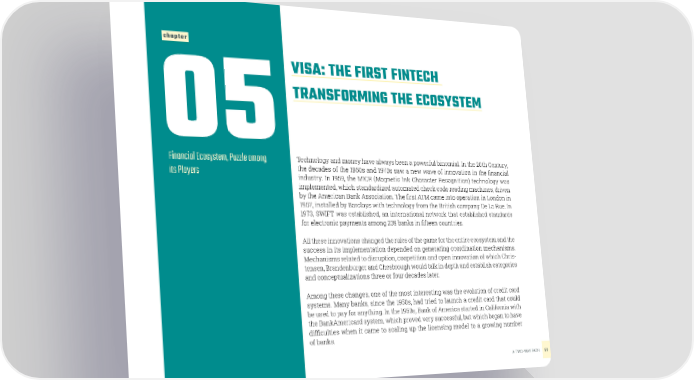 chapter VISA: THE FIRST FINTECH 05TRANSFORMING THE ECOSYSTEM Financial Ecosystem, Puzzle among Technology and money have always been a powerful binomial. In the 20th Century, its Players the decades of the 1960s and 1970s saw a new wave of innovation in the financial industry. In 1959, the MICR (Magnetic Ink Character Recognition) technology was implemented, which standardized automated check code reading machines, driven by the American Bank Association. The first ATM came into operation in London in 1967, installed by Barclays with technology from the British company De La Rue. In 1973, SWIFT was established, an international network that established standards for electronic payments among 239 banks in fifteen countries. All these innovations changed the rules of the game for the entire ecosystem and the success in its implementation depended on generating coordination mechanisms. Mechanisms related to disruption, coopetition and open innovation of which Chris- tensen, Brandenburger and Chesbrough would talk in depth and establish categories and conceptualizations three or four decades later. Among these changes, one of the most interesting was the evolution of credit card systems. Many banks, since the 1950s, had tried to launch a credit card that could be used to pay for anything. In the 1960s, Bank of America started in California with the BankAmericard system, which proved very successful, but which began to have difficulties when it came to scaling up the licensing model to a growing number of banks. A TWO-WAY PATH 57