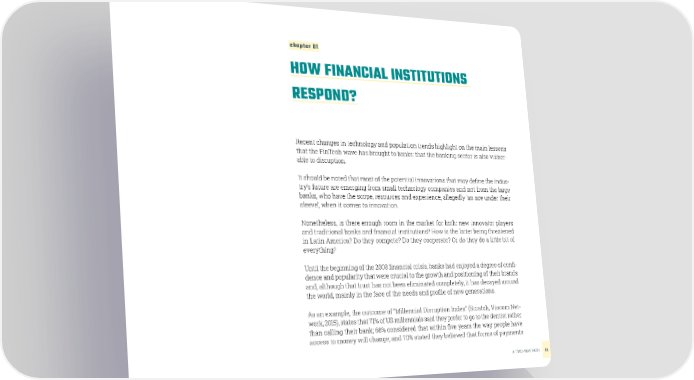 chapter 01 HOW FINANCIAL INSTITUTIONS RESPOND? Recent changes in technology and population trends highlight on the main lessons that the FinTech wave has brought to banks: that the banking sector is also vulner- able to disruption. It should be noted that most of the potential innovations that may define the indus- try’s future are emerging from small technology companies and not from the large banks, who have the scope, resources and experience, allegedly ‘an ace under their sleeve’, when it comes to innovation. Nonetheless, is there enough room in the market for both: new innovator players and traditional banks and financial institutions? How is the latter being threatened in Latin America? Do they compete? Do they cooperate? Or do they do a little bit of everything? Until the beginning of the 2008 financial crisis, banks had enjoyed a degree of confi- dence and popularity that were crucial to the growth and positioning of their brands and, although that trust has not been eliminated completely, it has decayed around the world, mainly in the face of the needs and profile of new generations. As an example, the outcome of “Millennial Disruption Index” (Scratch, Viacom Net- work, 2015), states that 71% of US millennials said they prefer to go to the dentist rather than calling their bank; 68% considered that within five years the way people have access to money will change; and 70% stated they believed that forms of payments A TWO-WAY PATH 18