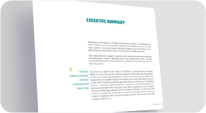 EXECUTIVE SUMMARY Technology is the catalyst for change and the financial industry is not exempt: en- terprise FinTechs are the ‘avalanche’ shaking up the banking industry as we had come to know it. Over the last decade, the financial industry has witnessed how new technology has tried to gain a place in the value chain of banking services. This study, based on a sample composed of five financial entities and a selection of entrepreneurs ―some of them associates of Startupbootcamp FinTech― gathers five key findings related to the emergence of FinTechs and their interaction with the financial system. 1 FinTech Law Latin America is home to more than 1,100 FinTechs. It is consolidated as a regional in Mexico has contributed leader in terms of innovation in the financial sector. Mexico has become a pioneer in offering a ‘surfing map’ approved by “FinTech Law”, which has no precedent on a to the future regional basis. This legislation places the customer at the center, allowing the customer of data usage and new to take control of his personal data, generated during any interaction with banking services. It considers a legal framework for innovators to prove the profitability of business models. new business models before deploying them, and certainly operate new concepts, such as crowdfunding, e-payment institutions and virtual assets. In other words, the FinTech Law makes the outlook clear for financial institutions and entrepreneurs, to find a level playing-field, a common language and clear rules that also allow them to explore collaboration. A TWO-WAY PATH 6