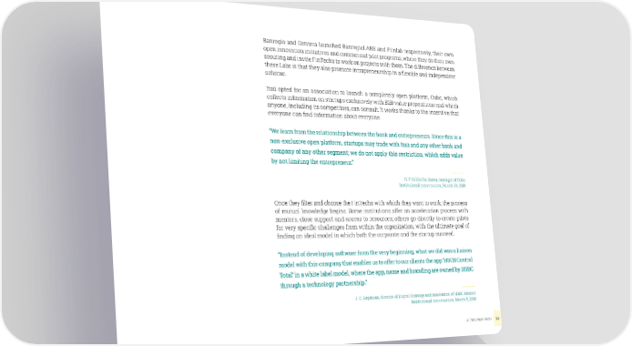 Banregio and Gentera launched BanregioLABS and Fiinlab respectively, their own open innovation initiatives and commercial pilot programs, where they do their own scouting and invite FinTechs to work on projects with them. The difference between these Labs is that they also promote intrapreneurship in a flexible and independent scheme. Itaú opted for an association to launch a completely open platform, Cubo, which collects information on startups exclusively with B2B value propositions and which anyone, including its competitors, can consult. It works thanks to the incentive that everyone can find information about everyone. “We learn from the relationship between the bank and entrepreneurs. Since this is a non-exclusive open platform, startups may trade with Itaú and any other bank and company of any other segment; we do not apply this restriction, which adds value by not limiting the entrepreneur.” R. P. Saldanha Gama, manager of Cubo Institutional conversation, March 28, 2018 Once they filter and choose the FinTechs with which they want to work, the process of mutual knowledge begins. Some institutions offer an acceleration process with mentors, close support and access to resources; others go directly to create pilots for very specific challenges from within the organization, with the ultimate goal of finding an ideal model in which both the corporate and the startup succeed. “Instead of developing software from the very beginning, what we did was a liaison model with this company that enables us to offer to our clients the app ‘HSCB Control Total’ in a white label model, where the app, name and branding are owned by HSBC through a technology partnership.” J. C. Espinosa, director of Digital Strategy and Innovation of HSBC Mexico Institutional conversation, March 5, 2018 A TWO-WAY PATH 53