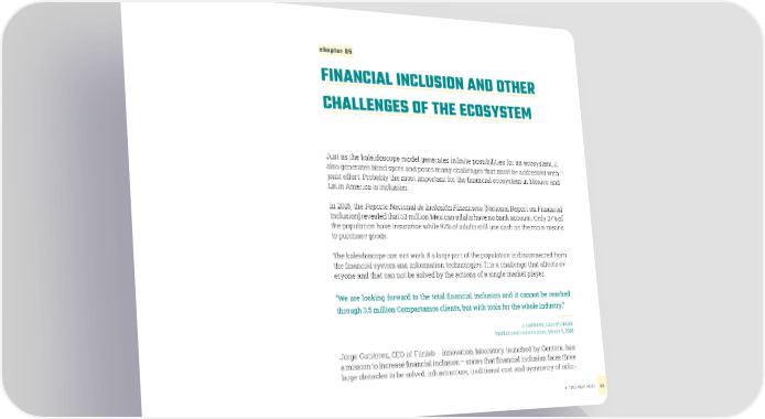 chapter 05 FINANCIAL INCLUSION AND OTHER CHALLENGES OF THE ECOSYSTEM Just as the kaleidoscope model generates infinite possibilities for an ecosystem, it also generates blind spots and poses many challenges that must be addressed with joint effort. Probably the most important for the financial ecosystem in Mexico and Latin America is inclusion. In 2016, the Reporte Nacional de Inclusión Financiera [National Report on Financial Inclusion] revealed that 53 million Mexican adults have no bank account. Only 37% of the population have insurance while 92% of adults still use cash as the main means to purchase goods. The kaleidoscope can not work if a large part of the population is disconnected from the financial system and information technologies. It is a challenge that affects ev- eryone and that can not be solved by the actions of a single market player. “We are looking forward to the total financial inclusion and it cannot be reached through 3.5 million Compartamos clients, but with tools for the whole industry.” J. Gutiérrez, CEO of Fiinlab Institutional conversation, March 9, 2018 Jorge Gutiérrez, CEO of Fiinlab ―innovation laboratory launched by Gentera, has a mission to increase financial inclusion― states that financial inclusion faces three large obstacles to be solved: infrastructure, traditional cost and symmetry of infor- A TWO-WAY PATH 63