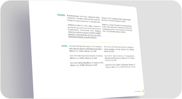 Bibliography Brandenburger, A.M. & B.J. Nalebuff (1996). Hamel, G. & C.K. Prahalad (1996). Competing for Coopetition: A Revolution Mindset that Combines the future. Harvard Businness School. Competition and Cooperation. Crown Business. Prats, M.J., J. Siota, T. Canonici & X. Contijoch (May, CNNMoney (May 22, 2018). Apple, Amazon y 2018). Open Innovation. Building, Scaling and Facebook van por los servicios financieros Consolidating Your Firm’s Corporate Venturing [Expansión]. Retreived from https:// Unit. IESE Business School, Opinno. expansion.mx/tecnologia/2018/05/21/apple- amazon-y-facebookvan-por-los-servicios- financieros?internal_source=PLAYLIST Interview Interview with Ricardo Arenas, CEO of Tesseract, Interview with Reynaldo Pestana Saldanha and Francisco Illescas, Chief Marketing Officer. Gama, manager of Cubo. Mexico City: IPADE, Mexico City: IPADE, February 22, 2018 March 28, 2018 Interview with Sergio Furio, founder of Creditas. Interview with Demetrio Strimpopulos, Mexico City: IPADE, February 26, 2018 BanregioLABS’s director. Mexico City: IPADE, February 26, 2018 Interview with Esteban Marín, co-founder of Dile. Mexico City: IPADE, February 12, 2018 Interview with Andrés Villaquirán, founder of Alkanza. Mexico City: IPADE, February 12, 2018 A TWO-WAY PATH 45