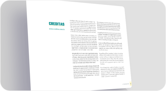 Creditas is the new face of credit in Brazil, “se- The company, currently with a 400-person team, cured loans”, that to-date has generated around finds in distribution and efficiency its two major CREDITAS 100 million dollars in placements. This platform challenges to escalate its position in the market. has transformed lives by offering opportunities Regarding efficiency, how to produce loan, Cred- that the people condemned to pay high interest itas already has allies: institutional investors. www.creditas.com.br rates, up to three digits, or people for whom a loan, at those costs, was unimaginable, did not have. Regarding distribution, how to gain new clients, Creditas visualizes its opportunity in direct Sergio Furio, after twelve years of working for branding: acquire clients through marketing financial institutions and providing strategic in Google, Facebook and other channels, and advice, found an alternative to this sub-ban- indirect branding, through a third party. karization reality by talking with his partner, because he saw for himself that only one third of In turn, Creditas divides branding into online and personal property (such as cars) and real estate offline. An example of online branding would are leveraged. At that point, he saw a business be an alliance with Uber, whose drivers, in the opportunity. A high number of borrowers have majority, are owners of the unit and they may properties ‒cars or houses‒ free of debt. be offered a loan. His geniality was to see a clear opportunity emerg- Regarding offline branding: Creditas formed an ing, to use these assets and reduce the high costs alliance with architects with whom interacts of loans. Thus, in 2012, he consolidated Creditas a client willing to make any modification to or in São Paulo, under the welcoming banner in its refurbish his home. Thus, when the architect webpage: “Revolutionizing loans in Brazil. Use submits his offer to the client, he accompanies your car or house and obtain better rates.” his offer with a payment option: a loan from Creditas. Creditas developed a model to design a framework enabling it to operate end-to-end loans; it found Even though, the model of Creditas may result the way to avoid being subject to the money attractive for other sub-bankarized markets in raising and placement regulations, therefore, it Latin America, Creditas will concentrate for the does not grant financing through other clients’ moment in Brazil. In 2017, Creditas’ business saving accounts ―as the bank does―, but insti- volume grew 7 times and Creditas foresees to tutional investments. make it grow 30 times by 2020. A TWO-WAY PATH 85