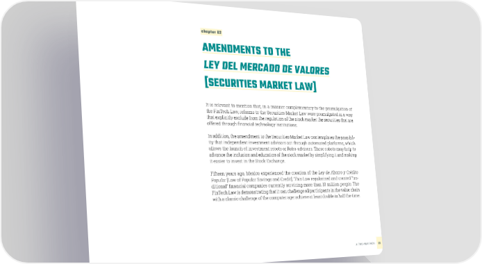 chapter 02 AMENDMENTS TO THE LEY DEL MERCADO DE VALORES [SECURITIES MARKET LAW] It is relevant to mention that, in a manner complementary to the promulgation of the FinTech Law, reforms to the Securities Market Law were promulgated in a way that explicitly exclude from the regulation of the stock market the securities that are offered through financial technology institutions. In addition, the amendment to the Securities Market Law contemplates the possibil- ity that independent investment advisors act through automated platforms, which allows the launch of investment robots or Robo-advisors. These robots may help to advance the inclusion and education of the stock market by simplifying it and making it easier to invest in the Stock Exchange. Fifteen years ago, Mexico experienced the creation of the Ley de Ahorro y Crédito Popular [Law of Popular Savings and Credit]. This Law regularized and created “tra- ditional” financial companies currently servicing more than 10 million people. The FinTech Law is demonstrating that it can challenge all participants in the value chain with a classic challenge of the computer age: achieve at least double in half the time. A TWO-WAY PATH 32
