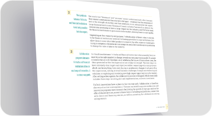 2 The symbiosis The myth that “dinosaurs” and “unicorns” cannot understand each other because between FinTechs they cannot communicate has started to fall apart - evidence that the weakness of one is the strength of another, and that symbiosis is not only possible but urgent. and financial institutions Large financial institutions (“dinosaurs”) need FinTechs (“unicorns”) to identify the is not only possible innovations promising to have a large impact on the industry, and FinTechs need the financial institutions to gain access to the market, allowing them to scale rapidly. but also urgent. Depending on their maturity and purpose, FinTechs adopt different roles in relation to the financial institutions: some are technology providers to large institutions, that allow them to issue white label products to improve the offer; some are challengers trying to compete in the same service categories; and others are disruptors promising to change the rules of play in the industry. 3 Collaborative For the alliance between FinTechs and financial institutions to be successful, the latter programs between must be in the right mindset to change towards an open innovation model. To initiate a transformation with the objective of redefining the future of financial services, the FinTechs and financial ideas generated within the organization are simply not enough. The next step is to institutions allow an have extremely clear targets and objectives before connecting with entrepreneurs: which can be anything from contributing to accelerate a change of culture within exchange of innovation, it the organization, solving internal business challenges through new technological is a two-way path. solutions, or exploring and escalating new high-impact opportunities in the market. After setting a clear agenda, the collaborative process is designed, which essentially includes three steps: scouting, pilot and implementation; and even investment. FinTech innovations have a place in this two-way path. Collaboration is therefore also very attractive to entrepreneurs. The most successful corporate acceleration and innovation programs have elements facilitating the growth of startups, such as the offer of shared services, access to know-how or technological platforms, connection with clients and financing sources, as well as promoting the collaboration among entrepreneurs. A TWO-WAY PATH 7