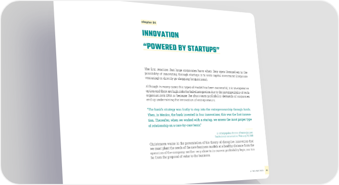 chapter 04 INNOVATION “POWERED BY STARTUPS” The first reaction that large corporates have when they open themselves to the possibility of innovating through startups is to seek capital investment (corporate venturing) or directly go shopping (acquisitions). Although in many cases this types of model has been successful, it is an expensive option and there are high risks for failed integration due to the incompatibility of each organization’s DNA or because the short-term profitability demands of corporates end up undermining the innovation of entrepreneurs. “The bank’s strategy was firstly to step into the entrepreneurship through funds. Then, in Mexico, the bank invested in four innovations; this was the first innova- tion. Thereafter, when we worked with a startup, we assess the most proper type of relationship on a case-by-case basis.” D. Strimpopulos, director of BanregioLABS Institutional conversation, February 26, 2018 Christensen warns in the presentation of his theory of disruptive innovation that we must plant the seeds of the new business models at a healthy distance from the operation of the company: neither very close to its current profitability logic, nor too far from the proposal of value to the business. A TWO-WAY PATH 49