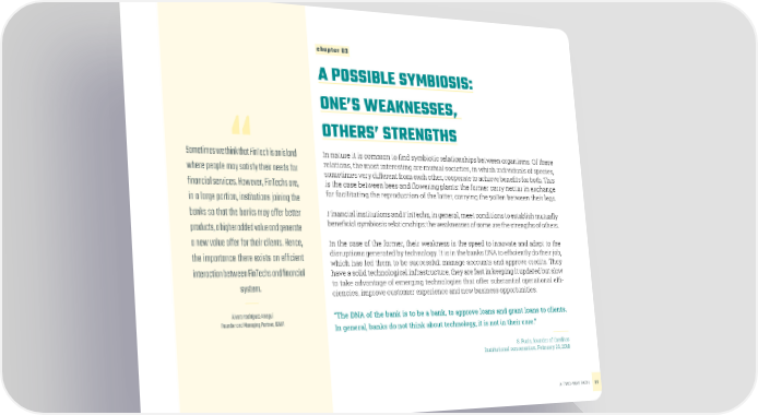chapter 03 A POSSIBLE SYMBIOSIS: ONE’S WEAKNESSES, OTHERS’ STRENGTHS Sometimes we think that FinTech is an island In nature it is common to find symbiotic relationships between organisms. Of these where people may satisfy their needs for relations, the most interesting are mutual societies, in which individuals of species, sometimes very different from each other, cooperate to achieve benefits for both. This financial services. However, FinTechs are, is the case between bees and flowering plants: the former carry nectar in exchange in a large portion, institutions joining the for facilitating the reproduction of the latter, carrying the pollen between their legs. banks so that the banks may offer better Financial institutions and FinTechs, in general, meet conditions to establish mutually products, a higher added value and generate beneficial symbiosis relationships: the weaknesses of some are the strengths of others. a new value offer for their clients. Hence, In the case of the former, their weakness is the speed to innovate and adapt to the the importance there exists an efficient disruptions generated by technology. It is in the banks DNA to efficiently do their job, which has led them to be successful: manage accounts and approve credits. They interaction between FinTechs and financial have a solid technological infrastructure, they are fast in keeping it updated but slow system. to take advantage of emerging technologies that offer substantial operational effi- ciencies, improve customer experience and new business opportunities. Álvaro Rodríguez Arregui “The DNA of the bank is to be a bank, to approve loans and grant loans to clients. Founder and Managing Partner, IGNIA In general, banks do not think about technology, it is not in their core.” S. Furio, founder of Creditas Institutional conversation, February 26, 2018 A TWO-WAY PATH 37
