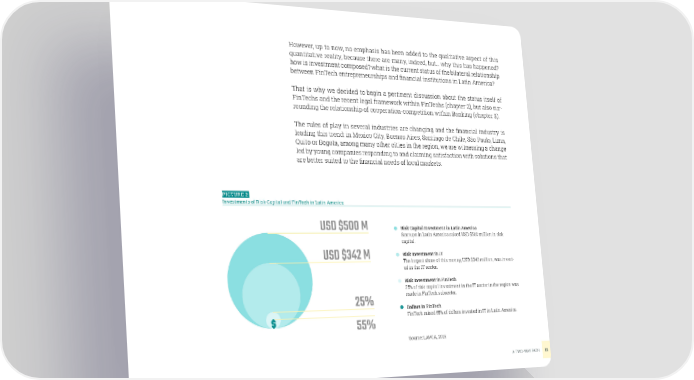 However, up to now, no emphasis has been added to the qualitative aspect of this quantitative reality, because there are many, indeed, but… why this has happened? how is investment composed? what is the current status of the bilateral relationship between FinTech entrepreneurships and financial institutions in Latin America? That is why we decided to begin a pertinent discussion about the status itself of FinTechs and the recent legal framework within FinTechs (chapter 2), but also sur- rounding the relationship of cooperation-competition within Banking (chapter 3). The rules of play in several industries are changing and the financial industry is leading this trend: in Mexico City, Buenos Aires, Santiago de Chile, São Paulo, Lima, Quito or Bogota, among many other cities in the region, we are witnessing a change led by young companies responding to and claiming satisfaction with solutions that are better suited to the financial needs of local markets. PICTURE 2 Investments of Risk Capital and FinTech in Latin America USD $500 M Risk Capital Investment in Latin America Startups in Latin America raised USD $500 million in risk capital. USD $342 M Risk Investment in IT The largest share of this money, USD $342 million, was invest- ed in the IT sector. Risk Investment in FinTech 25% of risk capital investment in the IT sector in the region was 25% made in FinTech subsector. Dollars in FinTech 55% FinTech raised 55% of dollars invested in IT in Latin America. Source: LAVCA, 2016 A TWO-WAY PATH 12