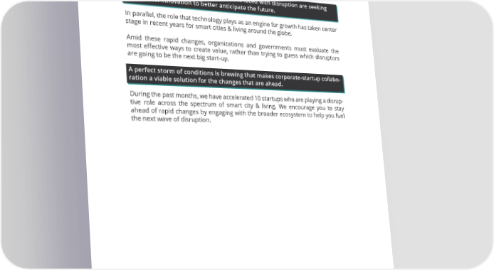 State of Technology We are currently living in a new golden age, one that is driven by rapid technologi- cal change. Emerging technology has the transformative power to disrupt entire industries and touch every angle of life. These changes have fuelled the need to better anticipate disruption. In order to grow and thrive, organizations faced with disruption are seeking for external innovation to better anticipate the future. In parallel, the role that technology plays as an engine for growth has taken center stage in recent years for smart cities & living around the globe. Amid these rapid changes, organizations and governments must evaluate the most effective ways to create value, rather than trying to guess which disruptors are going to be the next big start-up. A perfect storm of conditions is brewing that makes corporate-startup collabo- ration a viable solution for the changes that are ahead. During the past months, we have accelerated 10 startups who are playing a disrup- tive role across the spectrum of smart city & living. We encourage you to stay ahead of rapid changes by engaging with the broader ecosystem to help you fuel the next wave of disruption. 1