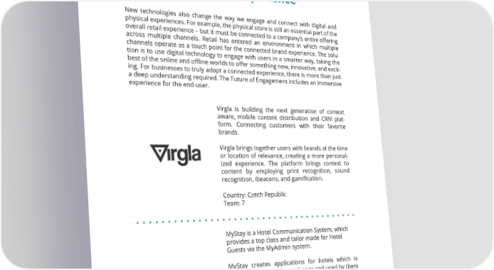 Smart Engagement & Connected Experience New technologies also change the way we engage and connect with digital and physical experiences. For example, the physical store is still an essential part of the overall retail experience – but it must be connected to a company’s entire offering across multiple channels. Retail has entered an environment in which multiple channels operate as a touch point for the connected brand experience. The solu- tion is to use digital technology to engage with users in a smarter way, taking the best of the online and offline worlds to offer something new, innovative, and excit- ing. For businesses to truly adopt a connected experience, there is more than just a deep understanding required. The Future of Engagement includes an immersive experience for the end-user. Virgla is building the next generation of context aware, mobile content distribution and CRM plat- form. Connecting customers with their favorite brands. Virgla brings together users with brands at the time or location of relevance, creating a more personal- ized experience. The platform brings context to content by employing print recognition, sound recognition, ibeacons, and gamification. Country: Czech Republic Team: 7 MyStay is a Hotel Communication System, which provides a top class and tailor made for Hotel Guests via the MyAdmin system. MyStay creates applications for hotels which is installed on guests smartphones and used by them before, during and after their stay in hotel as a virtu- al hotel assistant. In addition, Hotel managers can administrate their hotel APP to quickly update con- tent, make special offers and analyze data from guests behavior. Country: Czech Republic Team: 11 8