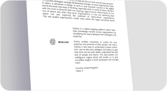 Smart Working The digital revolution is reshaping the way we live our lives and the way we work. As business strategies undergo fundamental changes, so must organisations’ take in talent. A wholesale re-design of work is now required. Success in the digital world demands new ways of thinking, especially when it comes to talent. Workers with the most in-demand skills are creating a ‘gig economy’, where they’re in con- trol of where and when they work. Organisations, in turn, are rethinking their talent mix and exploring the potential of talent-driven organisations. This will enable organisations create value within the hyper-connected world. Nuklius is a talent-mapping platform which facili- tates knowledge transfer across organisations by simplifying the way employees find colleagues and expertise. Nukius enables companies to unlock the true expertise and potential of their people. Not only is Nuklius a very easy to understand, human centric tool - we are also very intelligent. As Nuklius is used over time, we can even better understand the skill sets of people and teams. This data powers our intelligence engine which will enable us to give incredible insights to both employees and manage ment. Country: United Kingdom Team: 4 9