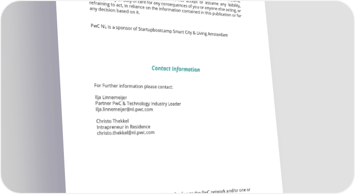 Notes This publication has been prepared for general guidance on matters of interest only, and does not constitute professional advice of any kind. You should not act upon the information contained in this publication without obtaining specific pro- fessional advice. No representation or warranty (express or implied) is given as to the accuracy or completeness of the information contained in this publication, and, to the extent permitted by law, PwC does not accept or assume any liability, responsibility or duty of care for any consequences of you or anyone else acting, or refraining to act, in reliance on the information contained in this publication or for any decision based on it. PwC NL is a sponsor of Startupbootcamp Smart City & Living Amsterdam Contact Information For Further information please contact: Ilja Linnemeijer Partner PwC & Technology Industry Leader [email protected] Christo Thekkel Intrapreneur in Residence [email protected] © 2016 PwC. All rights reserved. PwC refers to the PwC network and/or one or more of its member firms, each of which is a separate legal entity. Please see www.pwc.com/structure for further details. © 2016 Startupbootcamp Smart City & Living. All rights reserved. 12