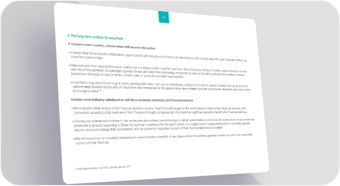 39 2. The long-term outlook for InsurTech If insurers aren’t careful, collaboration will become disruption ››Insurers that fail to exploit collaboration opportunities will lose ground to rivals and new entrants able to drive value through innovation driven by InsurTech partnerships ››New entrants from beyond insurance could enter the industry with InsurTech partners. We are already seeing reinsurers bypass primary insurers with InsurTech partners, but perhaps a greater threat will come from technology companies as well as the utility and telecoms sectors, as these businesses find ways to expand their current suites of products and enter new markets ››InsurTechs may also choose to go it alone, working with other start-ups or individually as they attract further venture capital funding. Recent Start upbootcamp research found 40% of InsurTechs saw themselves as disruptors rather than enablers and the potential for more full stack InsurTechs 14 to emerge is there Greater cross-industry collaboration will drive customer centricity and financial wellness ››Working with other sectors of the financial services industry, InsurTechs will be part of the move towards more holistic financial services, with consumers accessing a full overview of their finances through a single portal; this trend has significant potential benefits for financial wellness ››Industry boundaries will continue to blur as insurers (and others) use technology to deliver preventative solutions as well as insurance. A good example where this is already happening is CBien, the start-up in residence for this year’s cohort. It is a digital asset management platform that helps people secure, value and manage their possessions, with an option to insure them as part of their more comprehensive solution ››We will move from a crowded marketplace to a world where a handful of key players drive the wellness agenda and ensure consumers have total control of their finances 14 Startupbootcamp InsurTech, Startup Survey, 2017