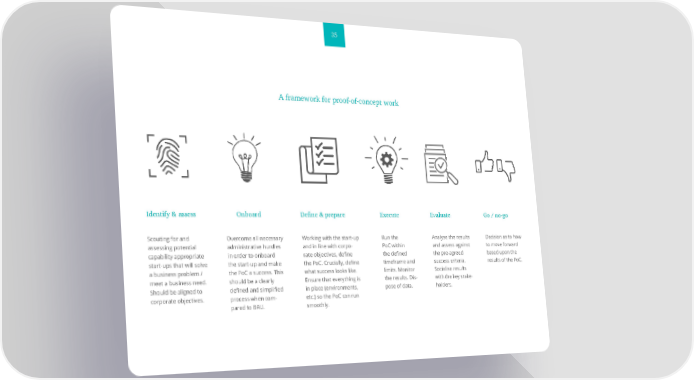 35 A framework for proof-of-concept work Identify & assess Onboard Define & prepare Execute Evaluate Go / no-go Scouting for and Overcome all necessary Working with the start-up Run the Analyse the results Decision as to how assessing potential administrative hurdles and in line with corpo- PoC within and assess against to move forward capability appropriate in order to onboard rate objectives, define the defined the pre-agreed based upon the start-ups that will solve the start-up and make the PoC. Crucially, define timeframe and success criteria. results of the PoC. a business problem / the PoC a success. This what success looks like. limits. Monitor Socialise results meet a business need. should be a clearly Ensure that everything is the results. Dis- with the key stake- Should be aligned to defined and simplified in place (environments, pose of data. holders. corporate objectives. process when com- etc.) so the PoC can run pared to BAU. smoothly.