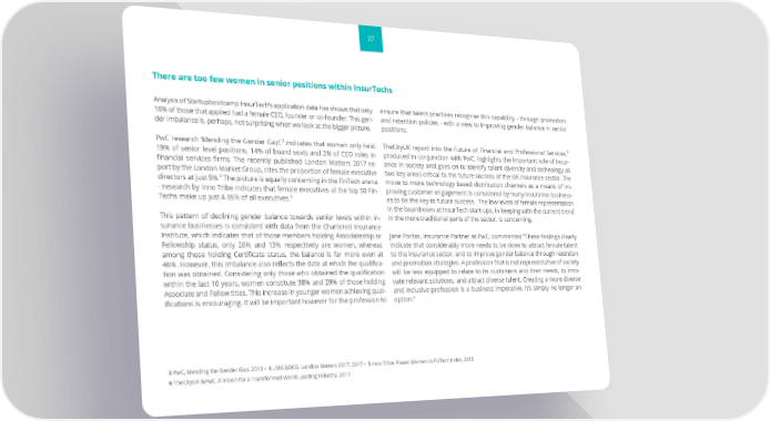 27 There are too few women in senior positions within InsurTechs Analysis of Startupbootcamp InsurTech’s application data has shown that only ensure that talent practices recognise this capability - through promotion 16% of those that applied had a female CEO, founder or co-founder. This gen- and retention policies - with a view to improving gender balance in senior der imbalance is, perhaps, not surprising when we look at the bigger picture. positions. 3 6 PwC research ‘Mending the Gender Gap’, indicates that women only held TheCityUK report into the Future of Financial and Professional Services, 19% of senior level positions, 14% of board seats and 2% of CEO roles in produced in conjunction with PwC, highlights the important role of insur- financial services firms. The recently published London Matters 2017 re- ance in society and goes on to identify talent diversity and technology as port by the London Market Group, cites the proportion of female executive two key areas critical to the future success of the UK insurance sector. The directors at just 5%.4 The picture is equally concerning in the FinTech arena move to more technology based distribution channels as a means of im- - research by Inno Tribe indicates that female executives at the top 50 Fin- proving customer engagement is considered by many insurance business- 5 es to be the key to future success. The low levels of female representation Techs make up just 4.95% of all executives. in the boardroom at InsurTech start-ups, in keeping with the current trend This pattern of declining gender balance towards senior levels within in- in the more traditional parts of the sector, is concerning. surance businesses is consistent with data from the Chartered Insurance Institute, which indicates that of those members holding Associateship or Jane Portas, Insurance Partner at PwC, commented “These findings clearly Fellowship status, only 26% and 13% respectively are women, whereas indicate that considerably more needs to be done to attract female talent among those holding Certificate status, the balance is far more even at to the insurance sector, and to improve gender balance through retention 46%. However, this imbalance also reflects the date at which the qualifica- and promotion strategies. A profession that is not representative of society tion was obtained. Considering only those who obtained the qualification will be less equipped to relate to its customers and their needs, to inno- within the last 10 years, women constitute 38% and 29% of those holding vate relevant solutions, and attract diverse talent. Creating a more diverse Associate and Fellow titles. This increase in younger women achieving qual- and inclusive profession is a business imperative, it’s simply no longer an ifications is encouraging. It will be important however for the profession to option.” 3 PwC, Mending the Gender Gap, 2013 • 4 LMG &BCG, London Matters 2017, 2017 • 5 Inno Tribe, Power Women in FinTech Index, 2015 6 TheCityUK &PwC, A Vision for a Transformed World-Leading Industry, 2017