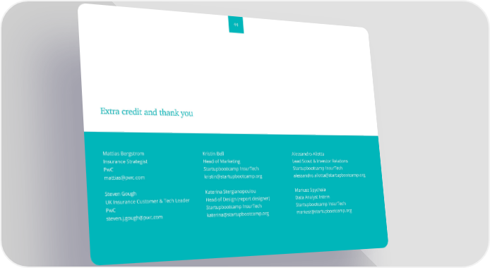 44 Extra credit and thank you Mattias Bergstrom Kristin Bell Alessandro Allotta Insurance Strategist Head of Marketing Lead Scout & Investor Relations PwC Startupbootcamp InsurTech Startupbootcamp InsurTech [email protected] [email protected] [email protected] Steven Gough Katerina Stergianopoulou Mariusz Spychala UK Insurance Customer & Tech Leader Head of Design (report designer) Data Analyst Intern PwC Startupbootcamp InsurTech Startupbootcamp InsurTech [email protected] [email protected] [email protected]