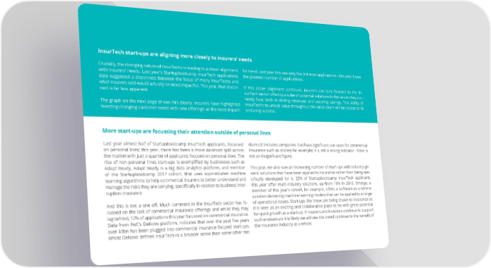 19 InsurTech start-ups are aligning more closely to insurers’ needs Crucially, the changing nature of InsurTechs is leading to a closer alignment ful trend. Last year this saw only the 3rd most applications - this year it saw with insurers’ needs. Last year’s Startupbootcamp InsurTech applications the greatest number of applications. data suggested a disconnect between the focus of many InsurTechs and what insurers said would actually be most impactful. This year, that discon- If this closer alignment continues, insurers can look forward to the In- nect is far less apparent. surTech sector offering a suite of potential solutions to the issues they cur- rently face, both in driving revenues and securing savings. The ability of The graph on the next page shows this clearly. Insurers have highlighted InsurTechs to unlock value throughout the value chain will be crucial to its ‘meeting changing customer needs with new offerings’ as the most impact- enduring success. More start-ups are focussing their attention outside of personal lines Last year almost half of Startupbootcamp InsurTech applicants, focussed diums (it includes companies that have significant use-cases for commercial on personal lines; this year, there has been a more balanced split across insurance such as drones for example) it is still a strong indicator - $3bn is the market with just a quarter of applicants focused on personal lines. The not an insignificant figure. rise of non-personal lines start-ups is exemplified by businesses such as Adapt Ready. Adapt Ready is a big data analytics platform, and member This year, we also saw an increasing number of start-ups with industry-ge- of the Startupbootcamp 2017 cohort, that uses sophisticated machine neric solutions that have been applied to insurance rather than being spe- learning algorithms to help commercial insurers to better understand and cifically developed for it. 22% of Startupbootcamp InsurTech applicants manage the risks they are carrying, specifically in relation to business inter- this year offer multi-industry solutions, up from 16% in 2016. Emerge, a ruption insurance. member of this year’s cohort, for example, offers a software-as-a-service solution delivering machine learning models that can be applied to a range And this is not a one off. Much comment in the InsurTech sector has fo- of operational issues. Start-ups like these are being drawn to insurance as cussed on the lack of commercial insurance offerings and whilst they may it is seen as an exciting and collaborative place to be with great potential lag behind, 12% of applications this year focussed on commercial insurance. for quick growth as a start-up. If insurers and investors continue to support Data from PwC’s DeNovo platform, indicates that over the past five years such endeavours it is likely we will see this trend continue to the benefit of over $3bn has been plugged into commercial insurance focused start-ups. the insurance industry as a whole. Whilst DeNovo defines InsurTech in a broader sense than some other me-
