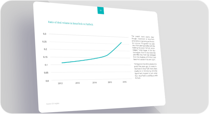 09 Ratio of deal volume in InsurTech vs FinTech 0.3 The overall trend seems clear though. Investment in InsurTech propositions is growing as the sec- 0.25 tor matures. This growth has seen InsurTech catch up further with the banking focussed FinTech sector. 0.2 Indeed, Tshidi Hagan of Old Mu- tual argues that this has been the year that InsurTech has ‘emerged 0.15 from the shadows of FinTech’ and become ‘a sector in its own right’. 0.1 The figure on the left illustrates this point. Five years ago, for every in- vestment in InsurTech there were 0.05 nearly ten in FinTech, by 2016 the figure had dropped to just under four. InsurTech is catching up with 0.0 FinTech. 2012 2013 2014 2015 2016 Source: CB Insights