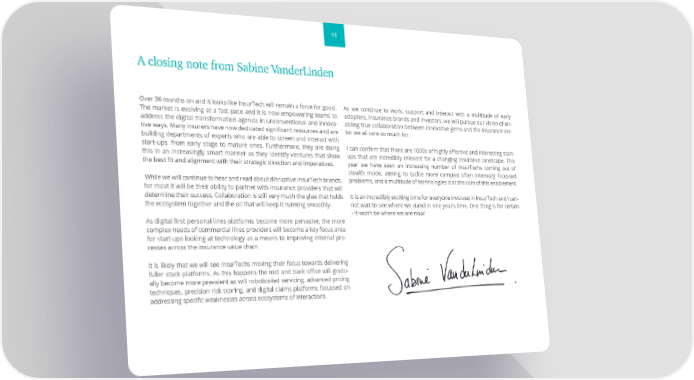41 A closing note from Sabine VanderLinden Over 36 months on and it looks like InsurTech will remain a force for good. As we continue to work, support and interact with a multitude of early The market is evolving at a fast pace and it is now empowering teams to adopters, insurance brands and investors, we will pursue our vision of en- address the digital transformation agenda in unconventional and innova- abling true collaboration between innovative gems and the insurance sec- tive ways. Many insurers have now dedicated significant resources and are tor we all care so much for. building departments of experts who are able to screen and interact with start-ups, from early stage to mature ones. Furthermore, they are doing I can confirm that there are 1000s of highly effective and interesting start- this in an increasingly smart manner as they identify ventures that show ups that are incredibly relevant for a changing insurance landscape. This the best fit and alignment with their strategic direction and imperatives. year we have seen an increasing number of InsurTechs coming out of stealth mode, aiming to tackle more complex often internally focussed While we will continue to hear and read about disruptive InsurTech brands, problems, and a multitude of technologies is at the core of this enablement. for most it will be their ability to partner with insurance providers that will determine their success. Collaboration is still very much the glue that holds It is an incredibly exciting time for everyone involved in InsurTech and I can- the ecosystem together and the oil that will keep it running smoothly. not wait to see where we stand in one year’s time. One thing is for certain - it won’t be where we are now! As digital first personal lines platforms become more pervasive, the more complex needs of commercial lines providers will become a key focus area for start-ups looking at technology as a means to improving internal pro- cesses across the insurance value chain. It is likely that we will see InsurTechs moving their focus towards delivering fuller stack platforms. As this happens the mid and back office will gradu- ally become more prevalent as will robotics-led servicing, advanced pricing techniques, precision risk scoring, and digital claims platforms focussed on addressing specific weaknesses across ecosystems of interactions.