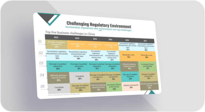 Challenging Regulatory Environment Inconsistent regulations and enforcement are top challenges Top five business challenges in China 2012 2013 2014 2015 2016 2017 Inconsistent regulatory Inconsistent regulatory Shortage of qualified 01 Rising labor costs Rising labor costs Rising labor costs interpretation and unclear interpretation and unclear management laws laws 44% 46% 61% 43% 57% 58% Inconsistent Inconsistent Inconsistent regulatory Inconsistent regulatory regulatory regulatory interpretation and unclear interpretation and Rising labor costs Rising labor costs 02 interpretation and interpretation and laws unclear laws 54% 58% unclear laws unclear laws 37% 38% 39% 47% 03 Shortage of qualified Shortage of qualified Shortage of qualified Shortage of qualified Difficulty obtaining Increasing Chinese employees employees employees employees required licenses protectionism 29% 35% 37% 42% 29% 32% 04 Difficulty obtaining Shortage of qualified Shortage of qualified Shortage of qualified Shortage of qualified Corruption required licenses management management employees management 30% 26% 31% 32% 29% 30% Shortage of qualified Difficulty obtaining Increasing Chinese Difficulty obtaining required 05 Corruption Industry overcapacity management required licenses protectionism licenses 26% 29% 30% 31% 30% 29% Source: China Business Climate Survey Report 2017